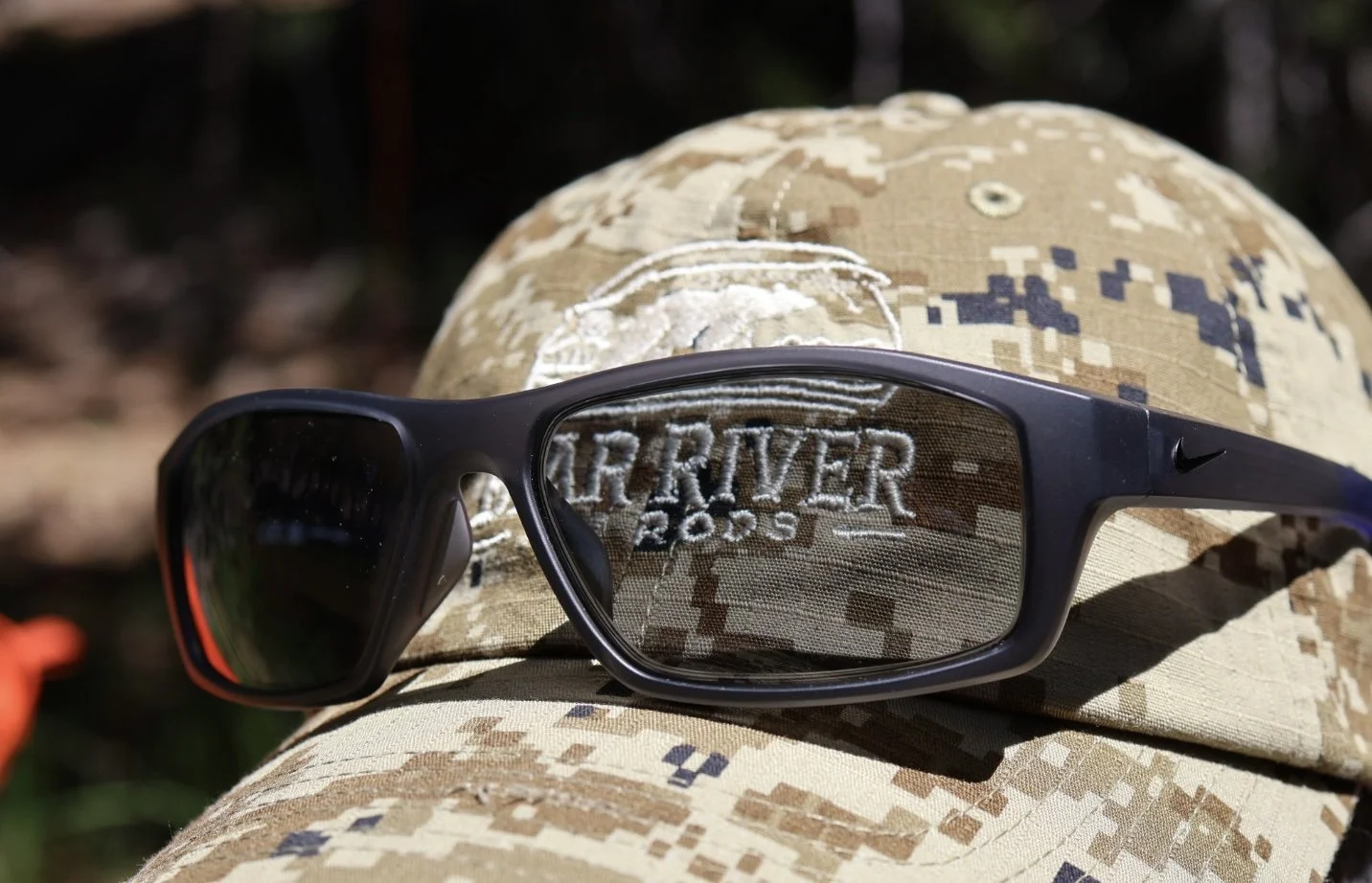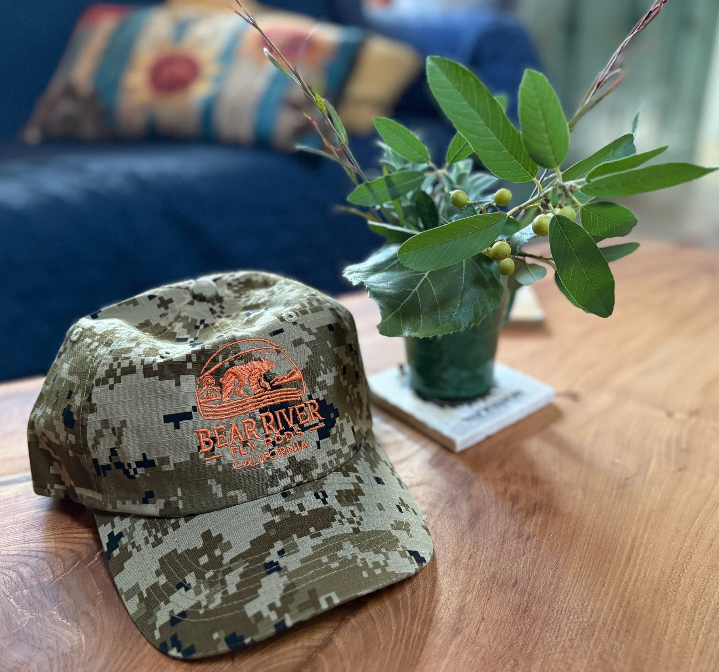 Bear River Fly Rods custom camo performance hat featuring embroidered logo with Sierra-inspired design.